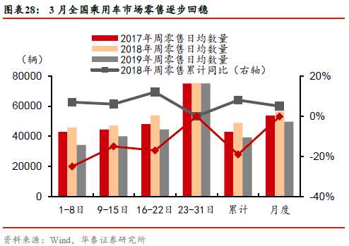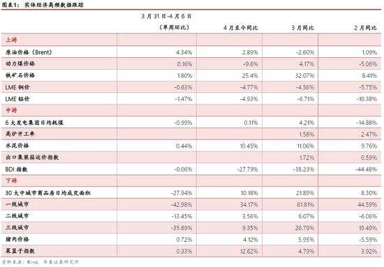 上周豬肉價格環(huán)比上行0.72%至22.26元/公斤,繼續(xù)小幅上漲,3月同比增幅5.95%,由負轉正。我們認為豬周期進入上行通道,但短期內(nèi)存在牛羊肉、雞肉的替代效應,豬肉對整體CPI的影響較為可控。3月30大中城市商品房日均成交面積同比增長21.9%,其中一、二、三線城市同比分別增長61.8%、6.1%和26.8%,相比2月增速均有明顯提升;此前統(tǒng)計局發(fā)布的70城房價數(shù)據(jù)顯示,2月一線城市二手房價環(huán)比增速由負轉正,市場活躍度有所改善。我們認為“因城施策”調(diào)控政策仍未全面放松,銷售數(shù)據(jù)改善仍呈現(xiàn)結構性特征,全國數(shù)據(jù)或仍承壓,預計地產(chǎn)投資增速將緩慢下行。