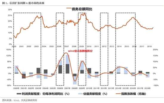 年初以來,我們用“債務總額同比增速”來衡量的信用周期,已經(jīng)出現(xiàn)非常明確的拐點。從2000年開始,中國一共經(jīng)歷了5輪信用擴張的階段(圖1方框中)。每一輪信用擴張的周期,對應到A股市場中,我們都可以發(fā)現(xiàn)一些明確的規(guī)律: