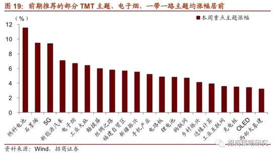 本周,我們跟蹤的重點(diǎn)主題指數(shù)漲幅數(shù)據(jù)顯示,單周漲幅最高的五大主題中,燃料電池主題漲幅 11.53%、石墨烯主題漲幅9.48%、5G主題漲幅9.39%、新能源汽車主題漲幅7.09%、電子煙主題漲幅6.68%。我們跟蹤的重點(diǎn)主題指數(shù)中,漲幅前20名的主題除了5G之外,觸摸屏、手機(jī)產(chǎn)業(yè)、邊緣計算、工業(yè)互聯(lián)網(wǎng)、OLED等主題。