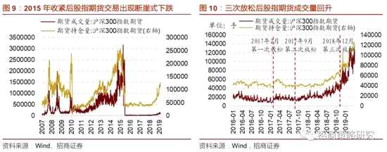 自2015年收緊股指期貨交易后,期貨成交量出現(xiàn)斷崖式下跌。2017年2月、2017年9月以及2018年12月三次均進(jìn)行一定程度的放松。在每次交易規(guī)則放松后,股指期貨的成交量和持倉量均出現(xiàn)回升。此次調(diào)整在2018年的基礎(chǔ)上,繼續(xù)降低交易保證金、降低手續(xù)費(fèi)率、提高日內(nèi)最大開倉量,有利于降低期貨交易成本,提高股指期貨市場的交易量,增加期貨產(chǎn)品流動性,活躍市場,以有效發(fā)揮其風(fēng)險對沖、套期保值的作用。