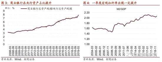 去年底央行做了一次擴(kuò)表,1月份連續(xù)實(shí)施了兩次降準(zhǔn),1-3月,社融顯著超預(yù)期,帶來經(jīng)濟(jì)企穩(wěn)的同時,也使得宏觀杠桿率有一定程度提升。商業(yè)銀行總資產(chǎn)規(guī)模/央行總資產(chǎn)規(guī)以及M2/GDP出現(xiàn)了抬升跡象。