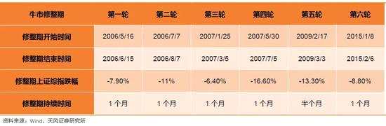 1、此前六輪牛市修整期大多持續(xù)1個月左右,上證指數(shù)跌幅在10%左右。