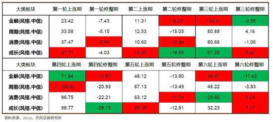 2、從這六輪牛市修整期大類板塊的表現(xiàn)中,可以得到一些結(jié)論: