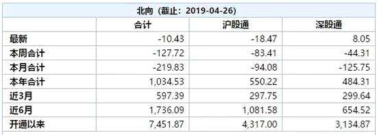 Wind數(shù)據(jù)顯示,4月26日,北向資金凈流出10.43億元,已連續(xù)5日凈流出,本周合計(jì)凈流出127.72億元。截至4月26日,4月北向資金累計(jì)凈流出近220億元,是2015年7月以來最高。