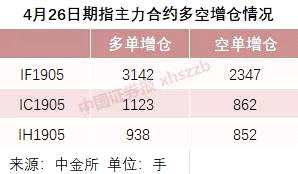 中金所數(shù)據(jù)顯示,4月26日,IF1905前20席位多單增加3142手,而空單增幅則為2347手;IC1905前20席位多單增倉(cāng)1123手,而空單則增倉(cāng)862手;IH1905前20席位多單增倉(cāng)938手,空單則增加852手。