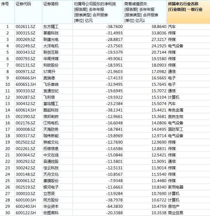 東方精工(002611)以38.86億元的商譽減值位居商譽減值損失首位;掌趣科技緊隨其后,商譽減值損失為33.8億元;聯(lián)建光電(維權)(300269)以28.88億元的商譽減值損失位列第三名。