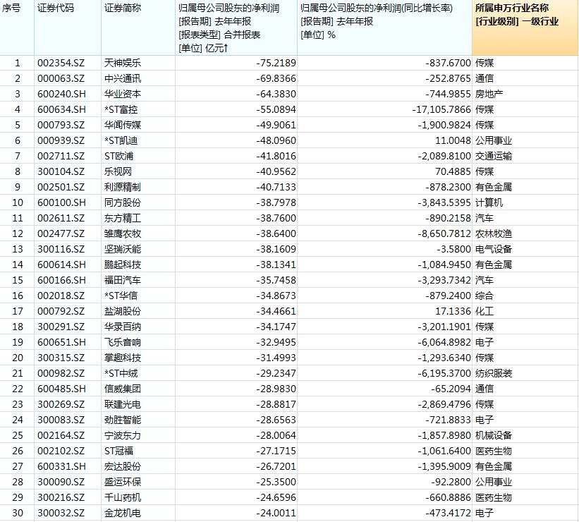其中,虧損超過40億元的有9家,分別是天神娛樂(002354)、中興通訊(000063)、華業(yè)資本(600240)、*ST富控(維權)(600634)、華聞傳媒(000793)、*ST凱迪(維權)(000939)、ST歐浦(維權)(002711)、【樂視網(300104)、股吧】(300104)、利源精制(維權)(002501)。