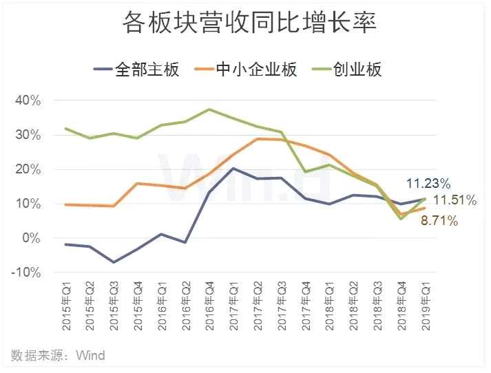 分板塊來(lái)看,主板和中小創(chuàng)的整體收入增速在2018年四季度達(dá)到階段底部后開(kāi)始回升,其中一季度創(chuàng)業(yè)板收入增長(zhǎng)最為明顯,達(dá)到11.51%。