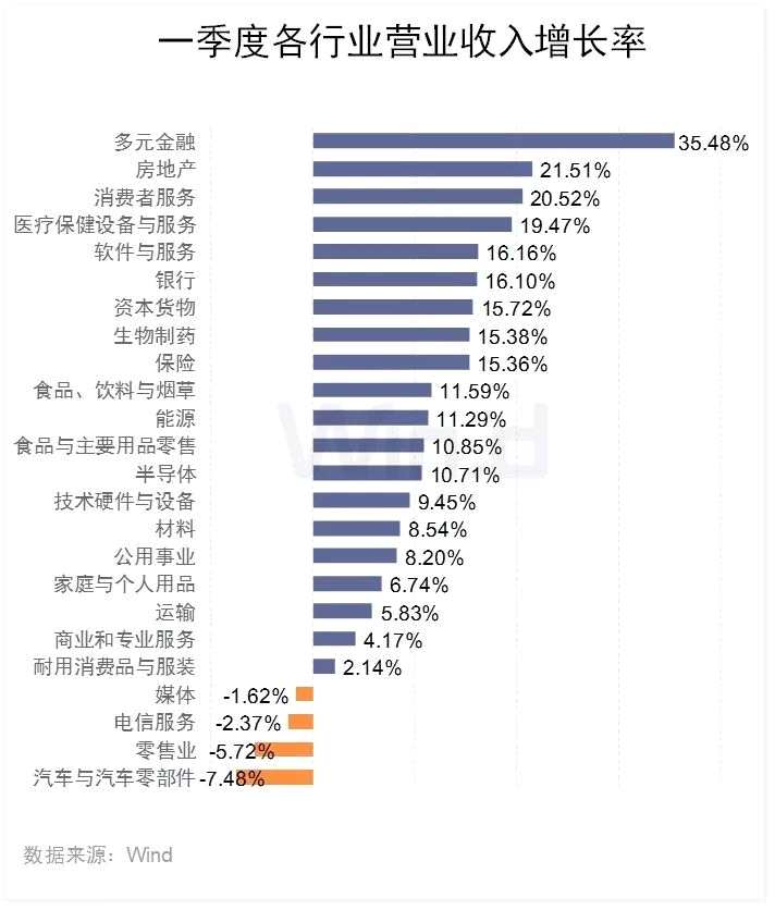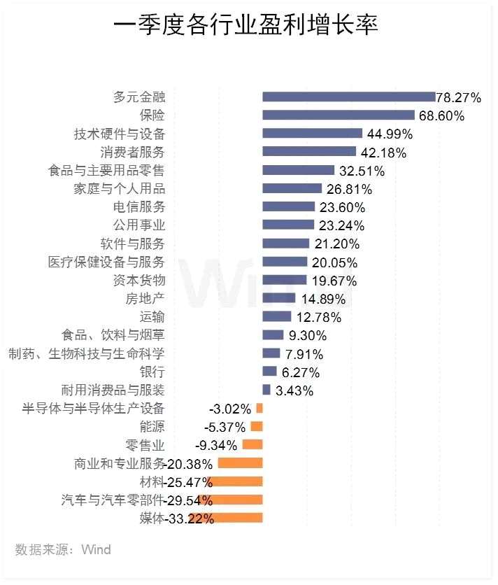 一季度,多元金融(78.27%)、保險(xiǎn)(68.6%)、技術(shù)硬件與服務(wù)(44.99%)、消費(fèi)者服務(wù)(42.18%)等行業(yè)盈利增速最快;媒體(33.22%)、汽車(chē)(29.54%)等行業(yè)業(yè)績(jī)承壓。