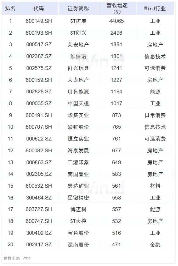 一季度,8家上市公司的營(yíng)業(yè)收入增速達(dá)到10倍以上,其中營(yíng)業(yè)收入增速最快的是ST坊展,收入增速約為440倍。