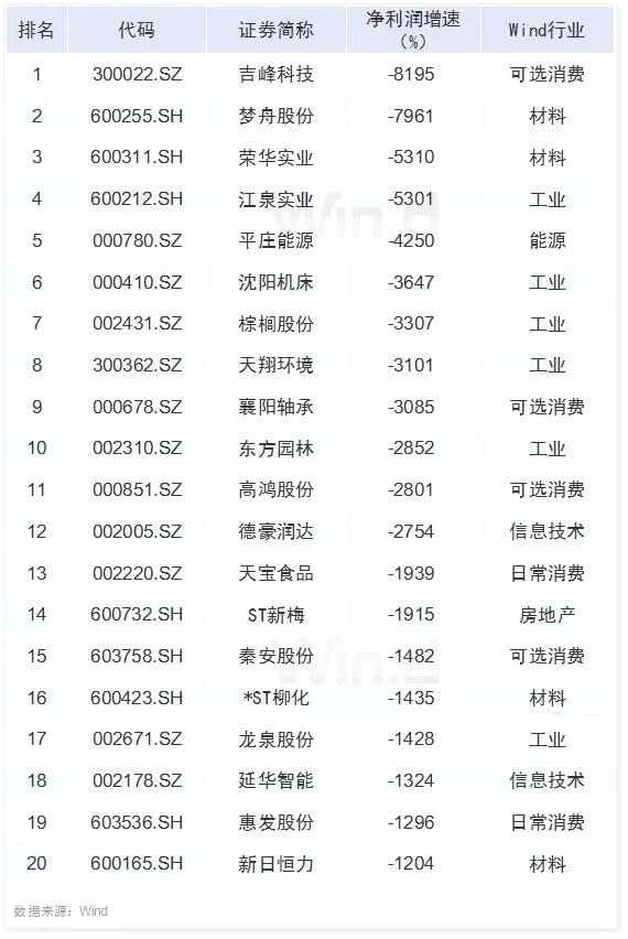 一季度,12家上市公司的歸屬母公司股東凈利潤(rùn)增速小于-2000%,其中增速降幅最大的是吉峰科技,為-8195%。