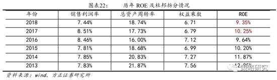 2018年全年銷售利潤率大幅下降拖累上市公司ROE下滑。全年來看,2018年受宏觀經濟下行壓力及集中計提商譽減值影響,整體ROE下滑至9.35%的近10年最低點,相較于2017年10.35%下滑0.9個百分點,其中銷售利潤率下降成為拖累ROE的主要原因,由2017年的8.51%下降至2018年的7.44%;總資產周轉率2018年小幅上行1個百分點至18.74%;權益乘數6.71,相較于2017年的6.79保持穩(wěn)定,企業(yè)杠桿水平小幅下降了1.2%。