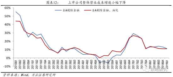 上市公司整體營業(yè)成本增速小幅下降。2019Q1單季度全A剔除金融后的營業(yè)成本增長11.30%,較2018Q4增速13.2%,有所小幅下行,延續(xù)2018年以來營業(yè)成本增速平穩(wěn)下行的趨勢。