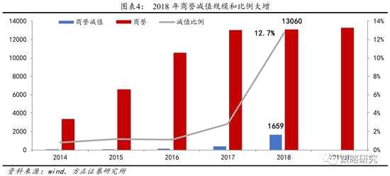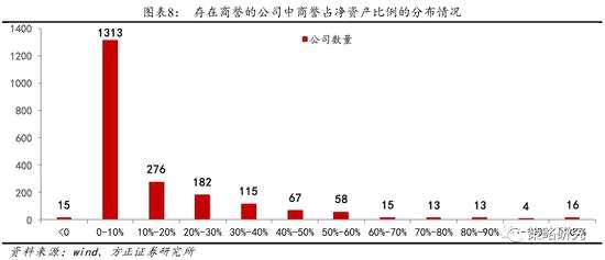 三大上市板商譽減值的規(guī)模大體相當,主板減值公司數量最多,傳媒、計算機、生物醫(yī)藥、機械設備、電氣設備這5個行業(yè)商譽減值規(guī)模居前。全A公司2018年商譽減值規(guī)模為1659億,其中主板、中小板和創(chuàng)業(yè)板商譽減值規(guī)模大體相當,分別是主板商譽減值559億、中小板583億、創(chuàng)業(yè)板517億。2018年,全A共有871家上市公司進行商譽減值,其中創(chuàng)業(yè)板公司涉及234家、中小板272家、主板365家。分行業(yè)來看,商譽減值規(guī)模居前的五大行業(yè)分別依次是傳媒、計算機、生物醫(yī)藥、機械設備和電氣設備,規(guī)模均在100億元以上,減值公司家數均在60家以上,其中傳媒行業(yè)商譽減值規(guī)模最大,達到481億元。商譽減值規(guī)模最小的五個行業(yè)分別是食品飲料、采掘、建筑材料、非銀金融、鋼鐵,銀行業(yè)沒有商譽減值。個股方面,【天神娛樂(002354)、股吧】2018年商譽減值規(guī)模高達41億元位列全A第一。