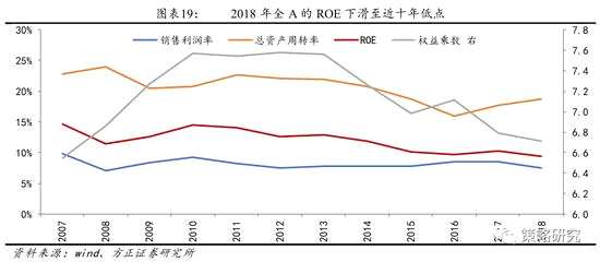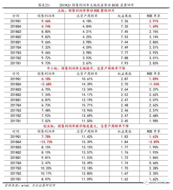 4、全A及各上市板塊盈利質量ROE全面好轉,銷售利潤率大幅提升是最重要的驅動力。根據杜邦分解,全A、三大上市板的銷售利潤率同時大幅提升、總資產周轉率小幅放緩、權益乘數即杠桿率維持相對穩(wěn)定。從2019Q1相對去年4季度的改善幅度看,創(chuàng)業(yè)板>中小板>主板>全A,分別改善了5.51、2.93、1.55、1.22個百分點。