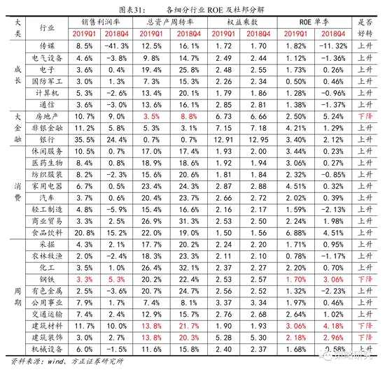 2.3  ROE角度:銷售利潤率回升帶動成長、金融、消費、周期類盈利質量全面回升2.3 ROE角度:銷售利潤率回升帶動成長、金融、消費、周期類盈利質量全面回升  大類行業(yè)來看,四大類行業(yè)盈利質量全面回升,成長、大金融、消費、周期2019Q1單季度ROE分別為1.40%、3.46%、3.17%、1.99%,相比2018年四季度分別提升3.76%、1.21%、2.35%、1.02%,成長與消費修復力度更大。修復的主要驅動力均為銷售利潤率的快速上行,成長、消費、周期行業(yè)的總資產周轉率出現(xiàn)了小幅下滑,四大類行業(yè)的權益乘數繼續(xù)保持穩(wěn)定。成長類行業(yè)中,傳媒受益于供給出清,2018年第四季度集中計提商譽減值,修復力度最大。大金融中,房地產總資產周轉率下降拖累盈利質量下滑。消費類行業(yè)整體回升,除汽車、商貿行業(yè)外,其余細分行業(yè)整體修復力度都較大。周期類行業(yè)中,鋼鐵由于鋼價下降導致銷售利潤率下降,建材及建筑裝飾行業(yè)受地產后周期屬性影響,總資產周轉率下降,ROE均出現(xiàn)了邊際下降。