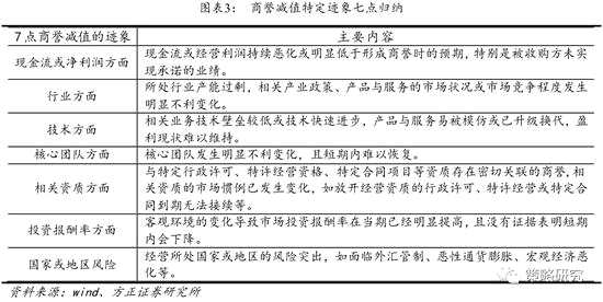 為強化上市公司商譽減值事項監(jiān)管,2018年11月證監(jiān)會出臺《會計監(jiān)管風險提示第8號——商譽減值》,提到公司應該至少在每年年度終了進行商譽減值測試,要充分關注商譽所在資產組或資產組組合的宏觀環(huán)境、行業(yè)環(huán)境、實際經營狀況及未來經營規(guī)劃等因素來判斷商譽是否存在減值跡象,且不能以簡單以并購重組相關方有業(yè)績補償承諾、尚在業(yè)績補償期間為由,不進行商譽減值測試。文件提到七點需要注意的特定減值跡象: