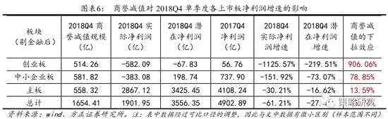 我們進行了商譽減值對凈利潤增速的下拉效應的測算。按照可比口徑,創(chuàng)業(yè)板2018Q4單季度凈利潤同比增速為-1094%(這包括了商譽減值的影響),若不考慮商譽減值,即把凈利潤加上商譽減值規(guī)??勺鳛闈撛趦衾麧櫍瑴y算出來潛在凈利潤的同比增速為-221%,因此可以測算出創(chuàng)業(yè)板的商譽減值將創(chuàng)業(yè)板的凈利潤同比增速從原本的-221%下拉至-1094%,下拉效應和降幅十分巨大。此外,對全A凈利潤而言,若不考慮商譽減值,則2018Q4單季度全A的潛在凈利潤同比增速應為-20%,但包含了商譽減值后的全A凈利潤實際同比增速為-40%,可見商譽減值對全A的2018Q4凈利潤增速影響也相當顯著。