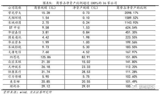 此外,根據2019Q1季報來看,大量公司存在商譽科目,部分公司商譽占凈資產比例較高,其中有16家公司占比超過了100%,值得注意。
