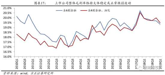 2019Q1全A毛利率大體穩(wěn)定或正常小幅波動。2019Q1剔除金融后的全A毛利率為19.34%,較2018第四季度的19.7%出現(xiàn)了小幅下滑。資本品價格下滑和PPI回落對工業(yè)企業(yè)的毛利率形成約束,由于工業(yè)企業(yè)的利潤占A股剔除金融的比例接近70%,因此A股剔除金融的毛利率也受到了一定影響,我們認為這屬于很正常的微弱波動。具體到各板塊: