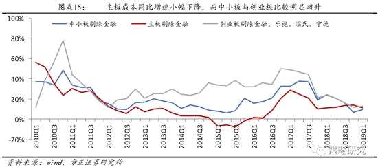 分板塊看,中小、創(chuàng)業(yè)板的營收和成本增速均出現(xiàn)了回升,而主板的營收和成本增速出現(xiàn)了小幅下滑。