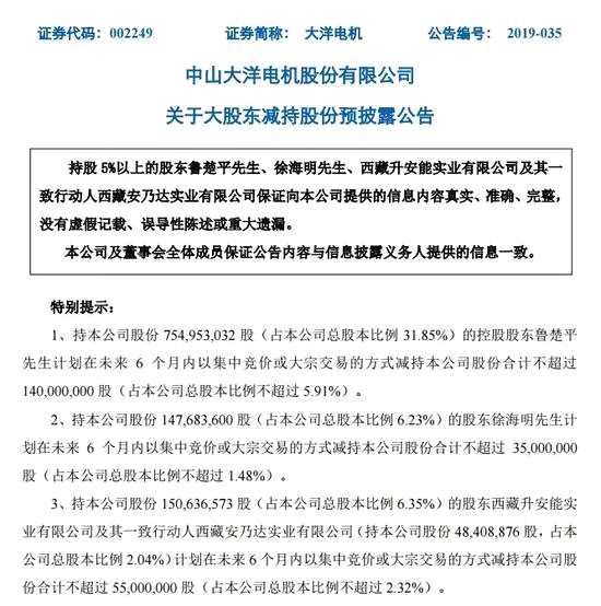 目前規(guī)模最大的減持計(jì)劃來(lái)自于大洋電機(jī)。公司5月6日晚間公告,控股股東魯楚平,股東徐海明、西藏升安能及其一致行動(dòng)人西藏安乃達(dá),擬6個(gè)月內(nèi)共計(jì)減持公司股份不超過(guò)2.3億股,占總股本9.71%。