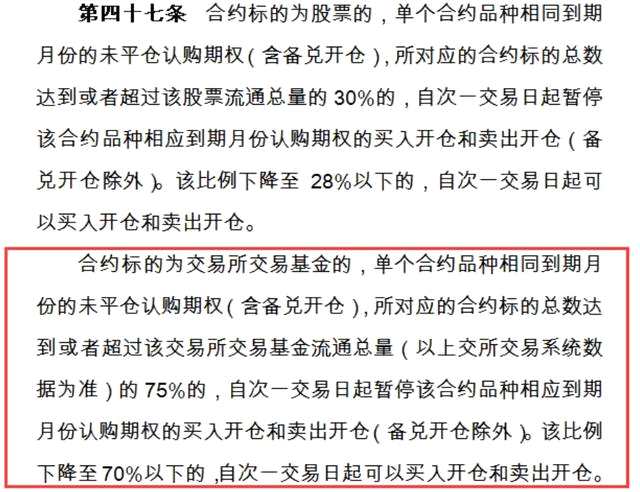 根據(jù)《上海證券交易所、中國證券登記結(jié)算有限責(zé)任公司股票期權(quán)試點(diǎn)風(fēng)險(xiǎn)控制管理辦法》第四十七條相關(guān)規(guī)定,上海證券交易所自2019年5月7日起,暫停到期月份為2019年5月的上證50ETF認(rèn)購期權(quán)合約的買入開倉和賣出開倉(備兌開倉除外)。該比例下降至70%以下后,自次一交易日起可以買入開倉和賣出開倉。限制開倉期間,投資者仍可對(duì)該合約進(jìn)行平倉交易。