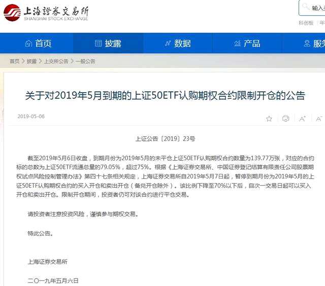 5月6日晚間,上交所發(fā)布《關(guān)于對(duì)2019年5月到期的上證50ETF認(rèn)購期權(quán)合約限制開倉的公告》。