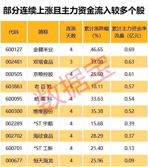 值得注意的是,22只連續(xù)上漲個(gè)股中,6只個(gè)股期間主力資金累計(jì)凈流入超過5000萬元。其中,累計(jì)資金流入最多的為金健米業(yè),主力資金累計(jì)流入0.69億元。