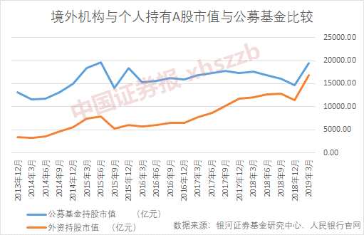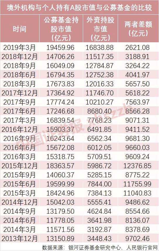 銀河證券基金研究中心數(shù)據(jù)顯示,截至2019年3月末,公募基金持股市值達(dá)19459.96億元,央行網(wǎng)站顯示,外資持股市值16838.88億元,二者僅差2621.08億元。此前,外資持股市值與公募基金持股市值相差最多時達(dá)12376.85億元。