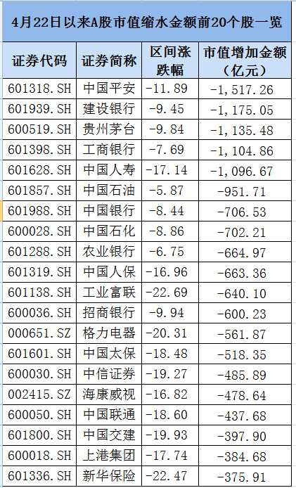具體到個(gè)股來(lái)看,4月22日至今期間,中國(guó)平安、建設(shè)銀行、貴州茅臺(tái)、工商銀行、中國(guó)人壽5股市值縮水最多,均在1000億元以上,縮水額分別為1517.3億、1175.1億、1135.5億、1104.9億、1096.7億元;中國(guó)石油、中國(guó)銀行、中國(guó)石化3股緊隨其后,期間市值縮水均超過(guò)700億元;另有包括農(nóng)業(yè)銀行、中國(guó)人保、工業(yè)富聯(lián)在內(nèi)的9股,期間市值縮水也比較多,均達(dá)到600億元以上。
