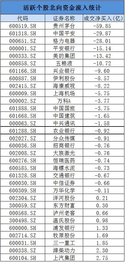 作為引領(lǐng)市場(chǎng)上漲的重要力量之一,北上資金凈今日流出56.81億元。自4月22日市場(chǎng)陷入調(diào)整以來(lái),除4月29日外,北上資金均為凈流出狀態(tài),合計(jì)凈流出近262億元。包括貴州茅臺(tái)、中國(guó)平安、格力電器等在內(nèi)的白馬個(gè)股均被北上資金靜賣(mài)出超10億元。