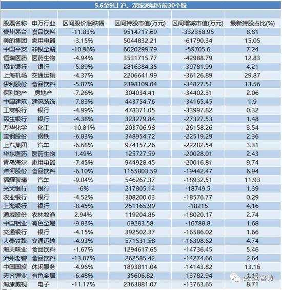 作為成交活躍股,貴州茅臺(tái)在本周前四個(gè)交易日內(nèi)股價(jià)跌幅超過10%,直至5月10日公司股價(jià)漲幅超過5.63%報(bào)收于907.12元/股;期間滬股通巨量凈賣出貴州茅臺(tái),累計(jì)達(dá)48億元,期間有3個(gè)交易日均創(chuàng)史上單日最大規(guī)模,最新持股比例已降至9%以下。