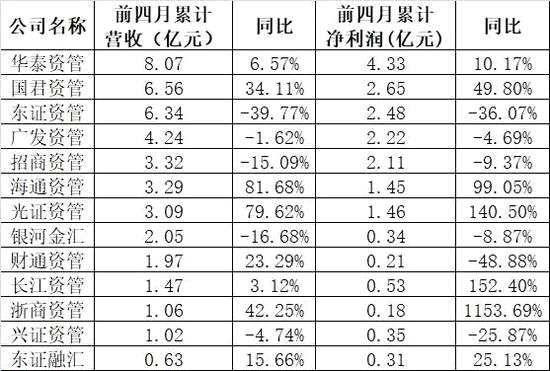 具體來看,前4個(gè)月,13家券商資管子公司中,7家公司累計(jì)凈利潤(rùn)超過1億元,4家公司凈利潤(rùn)同比增幅超50%。如光證資管前4個(gè)月凈利同比增幅達(dá)140.50%,營(yíng)收同比增幅達(dá)79.62%;海通資管前4個(gè)月凈利同比增幅達(dá)99.05%,營(yíng)收同比增幅達(dá)81.68%;浙商資管前4個(gè)月凈利同比增幅達(dá)1153.69%,營(yíng)收同比增幅達(dá)42.25%。