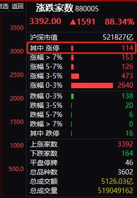 今天,兩市普漲,上漲個(gè)股3392個(gè),下跌個(gè)股164個(gè),其中漲停個(gè)股達(dá)114個(gè),跌停個(gè)股16個(gè),非ST個(gè)股無(wú)一個(gè)跌停。