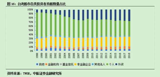 隨著外資流入,臺灣股市投資者結(jié)構(gòu)出現(xiàn)了顯著的變化。個人投資者持股數(shù)量占比從1990年的51.11%降至2018年的35.38%,機構(gòu)投資者持股數(shù)量占比持續(xù)提高。1998年,外資持股數(shù)量占比為8.73%,2018年末外資持股數(shù)量占比創(chuàng)年度新高,為27.65%。