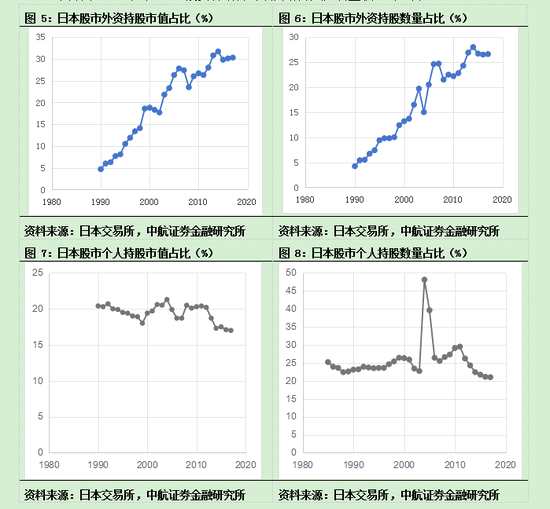 日本股市1964年開始國際化時間,很早就納入MSCI指數(shù)。1990年的數(shù)據(jù)顯示,日本股市中的外資持股比例為4.7%,外資持股數(shù)量占比為4.2%,說明外資持股的平均股票價格高于大盤均值。此后,兩者一直呈上升態(tài)勢。2014年,外資持股比例達到31.7%,持股數(shù)量占比為28%,兩者均達到歷史最高點。此后一直維持在高位。