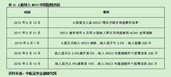 隨著國內(nèi)資本市場對外開放制度的建立和完善,A股的投資價值逐步受到了外資的認可。2017年6月21日,美國指數(shù)公司MSCI明晟宣布從2018年6月開始,將中國A股納入MSCI新興市場指數(shù)和MSCI ACWI全球指數(shù), 初選股票數(shù)為222只。2018年6月1日,A股正式納入MSCI指數(shù),初步的納入因子為之前公布的2.5%。此次正式納入的股票數(shù)為226只。納入MSCI指數(shù)是A股國際化的重要里程碑。2018年8月14日,MSCI發(fā)布實施A股納入MSCI中國指數(shù)的第二步,將納入因子從2.5%提升至5%,調(diào)整后A股占MSCI新興市場指數(shù)的權(quán)重達到0.75%。2019年5月14日MSCI公司發(fā)布半年度指數(shù)審議結(jié)果,如期將A股納入因子從5%提高至10%,包括18只創(chuàng)業(yè)板個股在內(nèi)的26只中國A股納入MSCI中國指數(shù)。