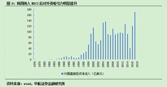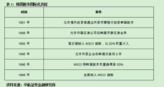 從MSCI指數(shù)的納入進程來看,盡管國際化的步伐較日本緩慢,韓國的起點同樣比較高。從部分納入到全面開放僅僅用了六年時間。