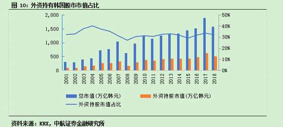 2001年的數(shù)據(jù)顯示,韓國股市總市值(包括KOSPI、KOSDAQ、KONEX)308萬億韓元,外資持股市值99萬億韓元,占總市值的比重為32.2%。此后,外資持股市值占比一直呈上升態(tài)勢,并在2004年達到高點,達到40.08%。在隨后韓國股市市值持續(xù)增長的過程中,外資持股市值占比一直處在高位。2018年末的數(shù)據(jù)顯示,韓國股市總市值達到1578萬億韓元,其中,外資持股市值為507萬億韓元,占總市值的比重為32.11%。