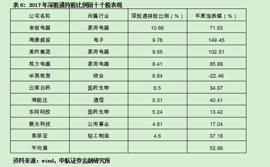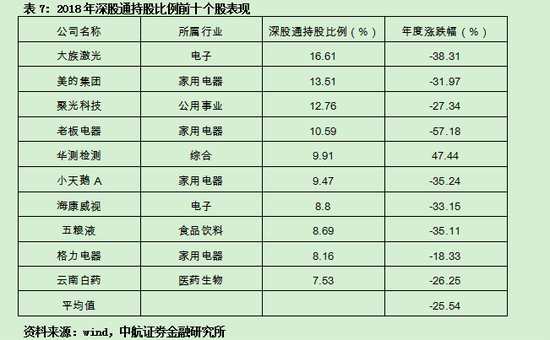 深股通開通時間較晚,通過分析2017和2018年深股通持股比例前十的個股表現(xiàn),不難發(fā)現(xiàn)其持股特征和滬股通相似,通常聚焦于行業(yè)龍頭,持股時間較長。從2017和2018年的兩年數(shù)據(jù)來看,深股通持股的穩(wěn)定性更高,持股比例前十的平均收益率遠遠高于深圳成指。(深圳成指2017、2018年的漲跌幅分別為8.48%和-34.42%)