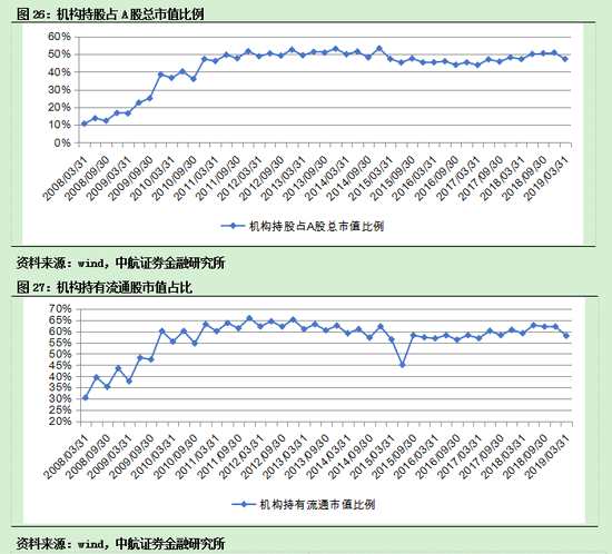 我們把上市公司前十大股東近似模擬為機構(gòu),截至2019年3月31日的數(shù)據(jù)顯示,機構(gòu)投資者持有全部股份的市值占總市值比例為47.20%、持有流通股市值占比為57.97%,兩者環(huán)比2018年數(shù)據(jù)出現(xiàn)下滑,預計和市場行情回暖、交投活躍、個人投資者環(huán)比增長有關(guān)。同成熟市場相比,A股的機構(gòu)投資者占比仍然偏低,機構(gòu)化空間巨大。
