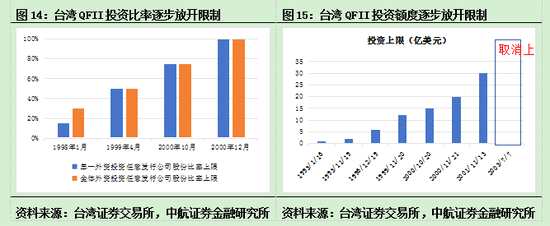 臺灣的股票市場國際化經(jīng)歷了三個階段:(1)準許華僑及外國人間接投資于臺灣的證券,買賣受益憑證。1983年設(shè)立國際、光華、建宏、中華四家投信公司,在海外募集臺幣資金,投入臺灣股市。(2)逐步放寬規(guī)定,允許外國證券公司進入臺灣。就在這一時期,臺灣于1990年準許外國專業(yè)投資機構(gòu)(QFII)直接進入臺灣證券市場。(3)全面開放僑外直接投資臺灣證券市場,于96年3月起開放外國自然人及法人直接投資臺灣股市,并且在核準額度上放寬了限制。