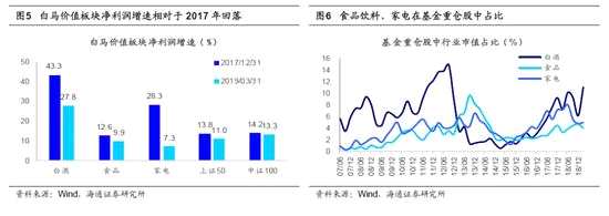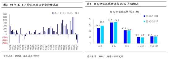 這次白馬股的估值盈利匹配度、資金流入動(dòng)能不如2017年。也有觀點(diǎn)認(rèn)為,今年的行情將類似2017年,“一九行情”可能會(huì)再次出現(xiàn),白馬價(jià)值股的持續(xù)性將更強(qiáng)。在2017年,市場(chǎng)風(fēng)格極致分化,17年上證綜指漲幅6.6%,而白馬價(jià)值板塊中上證50指數(shù)漲25%、食品飲料板塊漲幅56%、家電漲幅36%。今年以來同樣是白酒(累計(jì)漲幅62%)、農(nóng)林牧漁(56%)、食品(30%)、家電(33%)等板塊領(lǐng)漲。 “一九分化”真的會(huì)再現(xiàn)嗎?我們認(rèn)為,目前白馬價(jià)值股從估值盈利匹配度、以及資金流入的動(dòng)能方面,都不如2017年。第一,從估值盈利匹配度來看,白酒板塊目前PE(TTM)/2017年初PE(TTM)為28倍/24.7倍,19Q1/2017凈利潤(rùn)增速為27%/43%;食品板塊為34倍/33倍、9.8%/12.6%;家電為20.6倍/21倍、7.3%/28%;上證50指數(shù)為9.4倍/10.2倍,11%/13.8%;中證100指數(shù)為10.8倍/11.5倍,13.2%/14.2%。整體看絕對(duì)估值水平變化不大,但19年一季度的板塊凈利潤(rùn)增速相對(duì)于2017年已經(jīng)明顯放緩。第二,目前資金流入動(dòng)能不及2017年,2017年外資持續(xù)流入A股,推動(dòng)白馬價(jià)值股持續(xù)上漲。17年全年陸港通北上資金累計(jì)凈流入達(dá)1997.4億,月均流入166億。然而19年從4月以來陸港通北上資金開始凈流出,4、5月份北上資金分別凈流出180億、308億。陸港通北上資金以偏價(jià)值風(fēng)格的機(jī)構(gòu)投資者為主,北上資金連續(xù)凈流出也從側(cè)面反映目前白馬價(jià)值股的估值盈利匹配度不佳。從機(jī)構(gòu)投資者的倉位結(jié)構(gòu)來看,白馬價(jià)值股在基金倉位中占比較2017年初已經(jīng)明顯提高,白酒在基金重倉股中持倉占比從2016Q4的3.1%提升至2019Q1的11%,食品從2.3%升至4%,家電從4%升至5%,整體來看食品飲料及家電在基金重倉股中占比已經(jīng)從2016Q4的9.4%提升至約20%。