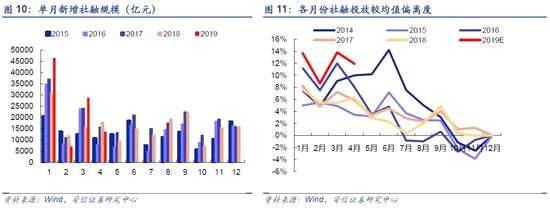 2019年一季度新增社融規(guī)模達到8.18萬億元,比去年同期的新增規(guī)模5.84萬億元多出40%??紤]到今年政府工作報告提到“穩(wěn)健的貨幣政策要松緊適度,廣義貨幣M2和社融規(guī)模增速與國內生產(chǎn)總值名義增速相匹配,以更好滿足經(jīng)濟運行保持在合理區(qū)間的需要”,而2018年名義GDP同比9.7%,社融增速9.8%。我們假設2019年名義GDP不低于2018年,存量社融增速基本與名義經(jīng)濟增速同步,樂觀假設其提升至10.5%,對應全年新增社融21.1萬億元,在這一偏樂觀估算下,前4個月社融投放規(guī)模已占到45.3%,超過過去5年同期均值水平40.1%約5.2個百分點,這意味下半年社融投放有趨緩的約束。