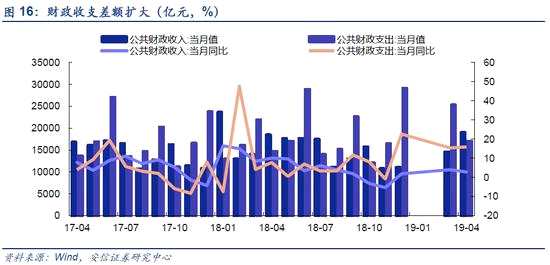 財政政策還存在一定空間,但同時也需要注意到,從1-4月財政支出角度看,財政收支差額已經(jīng)達到3016億元,達到了歷史同期最大值。1-4月全國一般公共預算收入72651億元,同比增長5.3%。全國一般公共預算收入中的稅收收入63692億元,同比增長4.6%,財政支出增速持續(xù)高于收入增速。