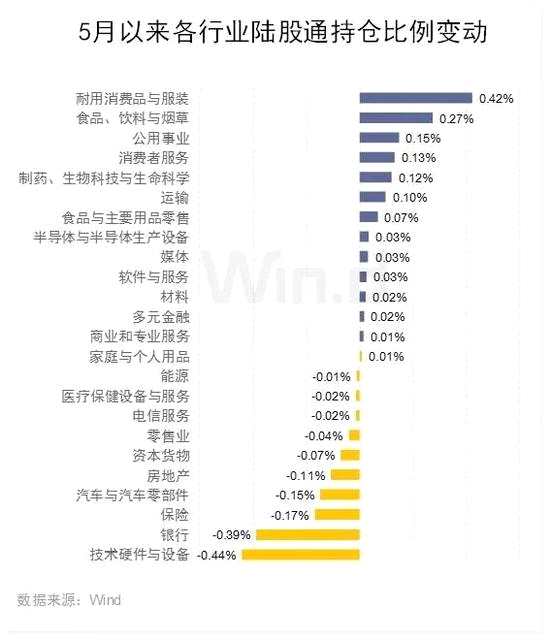 從持倉(cāng)占比的變化角度,與4月底相比,持股市值占比上升的行業(yè)稍多。其中技術(shù)硬件與設(shè)備、金融股遭外資減倉(cāng),消費(fèi)股獲加倉(cāng)。Wind數(shù)據(jù)顯示,5月以來(lái),陸股通持倉(cāng)占比增幅最大的前5個(gè)行業(yè)分別為耐用品與服裝、食品飲料、公用事業(yè)、消費(fèi)者服務(wù)、生物制藥,增幅分別為0.42%、0.27%、0.15%、0.13%、0.12%。