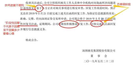 公告中雖然禮貌地向市場透露出正在積極準備回復的材料,但一句“預計將于2019年5月28日前階段性回復關(guān)注函”,似乎透露出公司已經(jīng)做好進行擠牙膏式回復的準備。