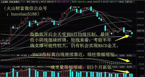 火山君(微信公眾號:huoshan5188)注意到:今日指數(shù)低開后全天受到5日均線壓制,最終收小陰線繼續(xù)回調(diào)。盤面上,僅個別板塊個股翻紅,中小盤概念股下滑明顯。滬市成交量微幅縮減,創(chuàng)出3個月新低;MACD指標(biāo)黃白線繼續(xù)靠近,綠柱繼續(xù)縮短。