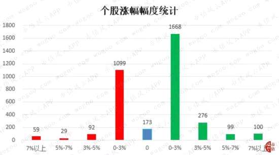 截至今日收盤,共有1279只個股上漲,占全部正常交易股票的35.58%。共有2143只個股下跌,占全部正常交易股票的59.61%。